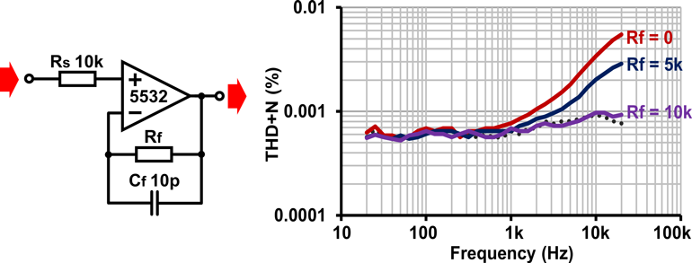 6.反相運算放大器級顯示沒有可測量的失真。未補償?shù)耐噙\算放大器級表現(xiàn)出共模失真,但是當Rs = Rf || R1且Cs = Cf時,幾乎可以完全補償。虛線是測量平臺;在所有情況下均為14-dBu輸入。