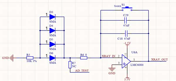 本測(cè)試電路的核心是積分電路:X射線照射D6二極管,會(huì)產(chǎn)生光升暗電流,是積分電路C29兩端的電壓上升快。測(cè)量C29電容端的電壓就可得知x射線劑量。